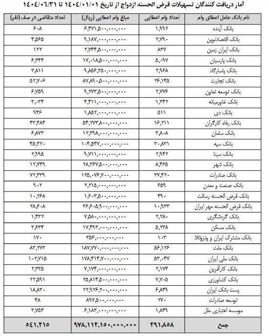 بر اساس این آمار از ابتدای امسال تا شهریور 1404، نظام بانکی 291 هزار و 858 وام ازدواج به متقاضیان پرداخت کرده است همچنین بانک ملت در میان بانکها بیشترین میزان پرداخت تسهیلات را با پرداخت 18 هزار و 700 میلیارد تومان داشته است.
