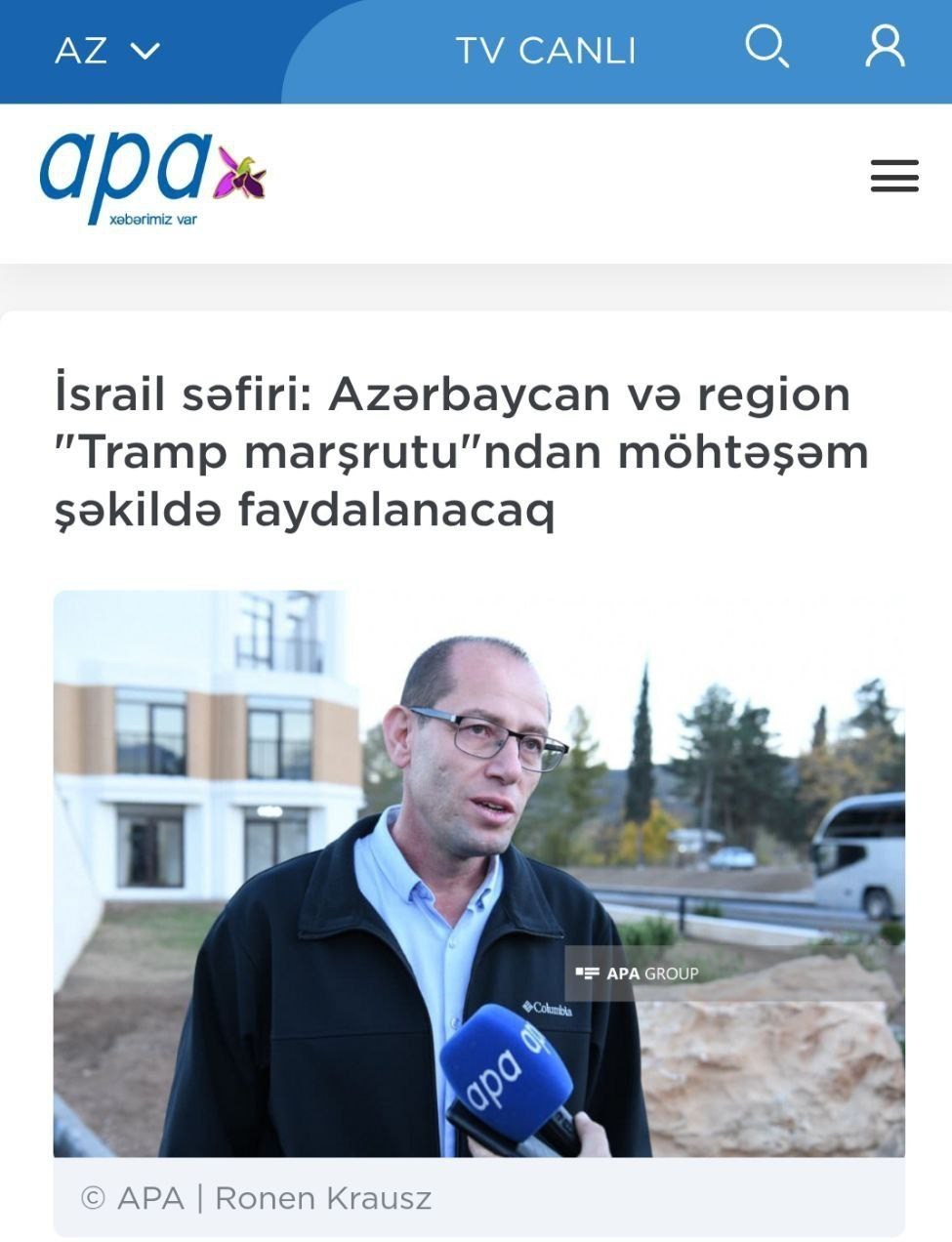 سفیر اسرائیل در آذربایجان در اظهاراتی مشکوک گفت: کریدور زنگزور که این روزها به دلیل دخالت مستقیم ترامپ در این مسئله به «کریدور ترامپ» معروف شده، نه تنها برای قفقاز جنوبی، بلکه برای سایر مناطق نیز مفید خواهد بود.