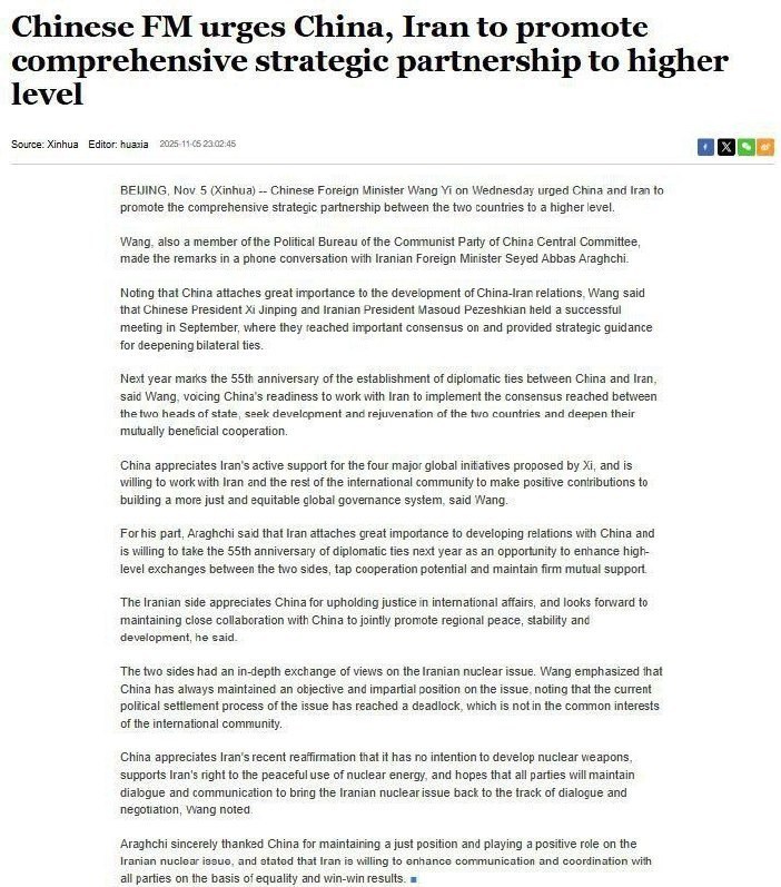 وزارت امور خارجه چین اعلام کرد که وانگ یی، وزیر خارجه این کشور در تماس تلفنی با سید عباس عراقچی خواستار ارتقای سطح مشارکت استراتژیک جامع با ایران شد و بر آمادگی پکن برای توسعه و تعمیق همکاریهای دوجانبه تأکید کرد. وی همچنین چهار ابتکار عملی شی جینپینگ را برای همکاری با ایران برجسته کرد.