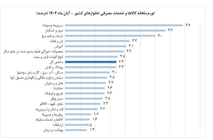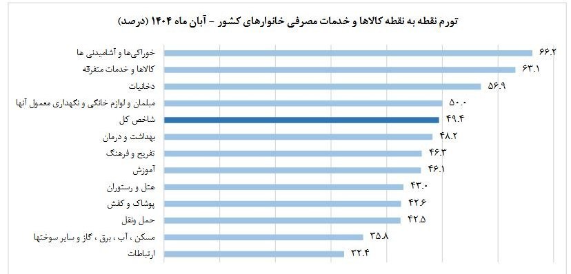 براساس گزارش مرکز آمار تورم نقطه به نقطه در آبان ماه سال 1404 به 3.4 درصد رسیده است؛ همچنین براساس گزارش این مرکز، تورم نقطه به نقطه به 49.4 درصد رسیده است که این آمارها حاکی از افزایش نرخ تورم به مانند ماههای گذشته در کشور دارد.