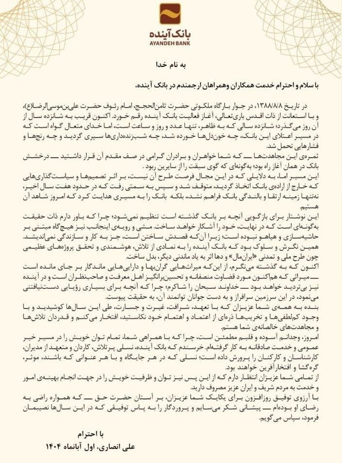 او البته در محتوای این نامه معتقد است که در جهت رفاه مردم و کشور گام برداشته و ایران مال را یک اثر تمدنی معرفی کرده! در حالیکه بانک آینده دارای زیان انباشتهای بیش از 500 همت است.
