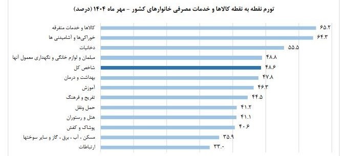 همچنین گروه کالاها و خدمات متفرقه با رشد 65.2 درصدی به نسبت مهر 1403 بیشترین افزایش قیمت را در میان گروههای کالایی تجربه کرده است؛ افزون بر این گروه کالایی خوراکیها و آشامیدنیها نیز با افزایش 64.3 درصدی به نسبت مهر سال گذشته دومین گروهکالایی با بیشترین رشد قیمتی است که این نشان از افزایش قیمت اقلام اساسی خانوار دارد.