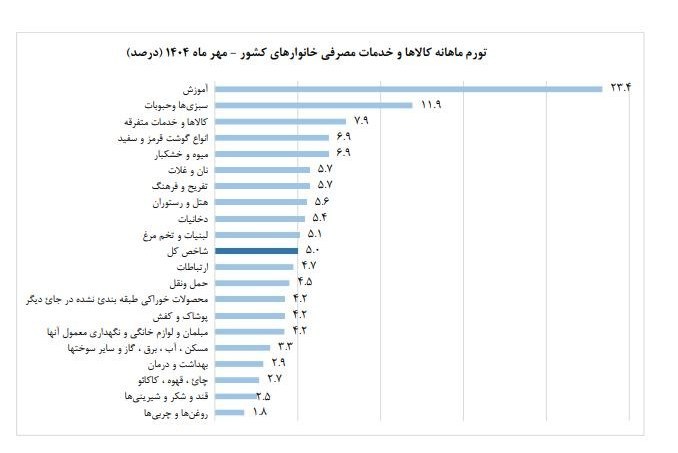 در نرخ تورم ماهانه کالاها گروه کالایی آموزش با افزایش 23.4 درصدی بیشترین رشد قیمتی را داشته است؛ علاوه بر این سبزی و حبوبات با افزایش 11.9 درصدی بعد از آموزش بیشترین افزایش قیمت را تجریه کرده است.