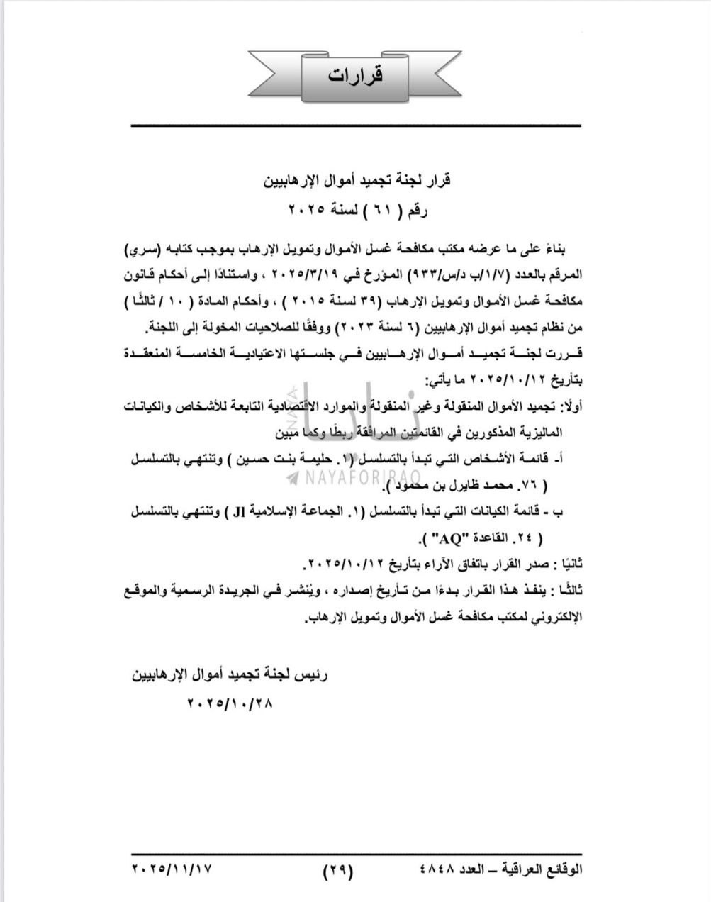 امروز در روزنامه رسمی دولت عراق، گزارشی مبنی بر طبقهبندی گروههای مقاومت حزبالله لبنان و انصارالله یمن در رده «گروههای تروریستی» و توقیف داراییهای مالی آنان در عراق توسط دولت این کشور منتشر شد، که خشم گسترده طیف زیادی از مردم، اصحاب رسانه و برخی سیاستمداران را در پی داشت.